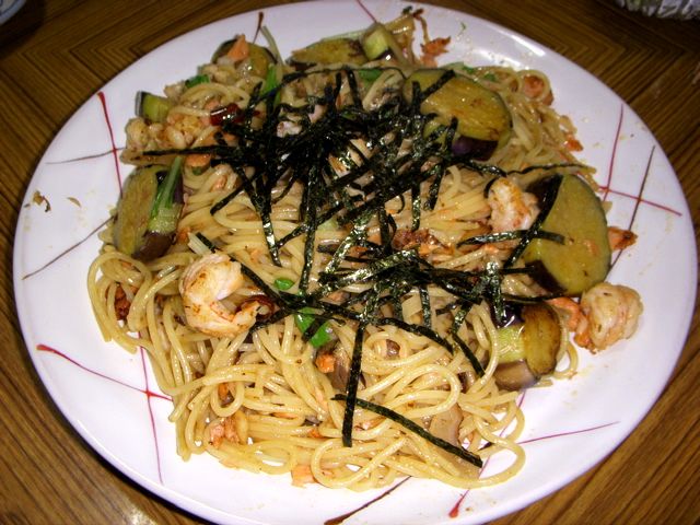 ★エビと鮭といわし(オイル漬け缶唐辛子入り)と茄子と水菜のスパゲティー