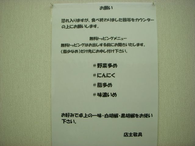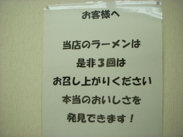 ラーメンデーターベースではここの店員が、愛想もなく態度も悪いばかりでなく、作業中にトランクスのかなに手を突っ込んで尻をかいたり、待ってる客がいるのに、外のベンチでタバコを吹かしたりと、極めて悪劣行為をしてたって書いてあった。それはすぐうなずけたぜ。