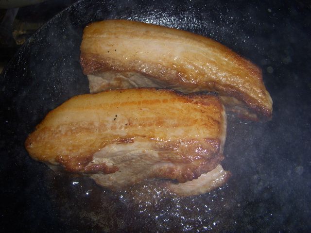 6、取り出したチャーシューを薄切りにして塩コショウで味付けして網で焼く。