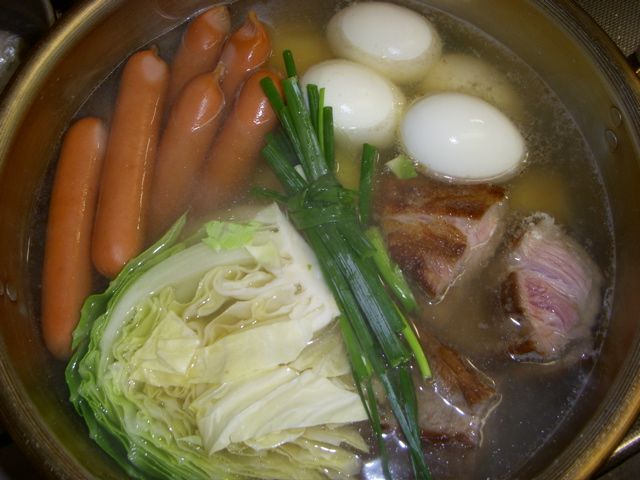 ★全てを投入後の画像。玉子は別鍋で茹でていたもの。フランクも別鍋で茹でて脂抜きをしています…