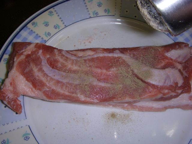 3、焼き上げる前にコショウをふっておく。コショウも肉にもんでおくといい。