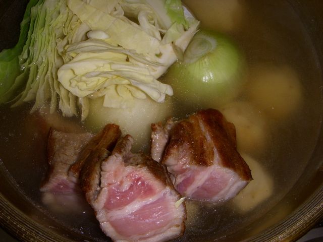 7、それから好きなものを投入して最後焼きを入れた豚バラ肉(チャーシューとも言う(笑))を適当な大きさに切って投入し、とろ火で1時間くらい煮たら出来上がり。