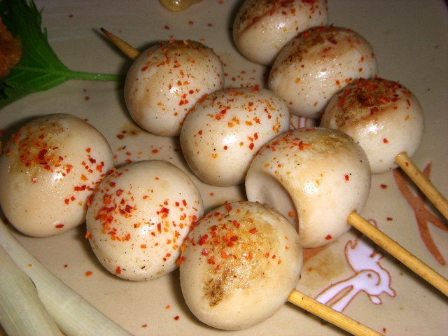 うずらたまごをいったんめんつゆで煮て、それを串に刺してフライパンで軽く焼く。