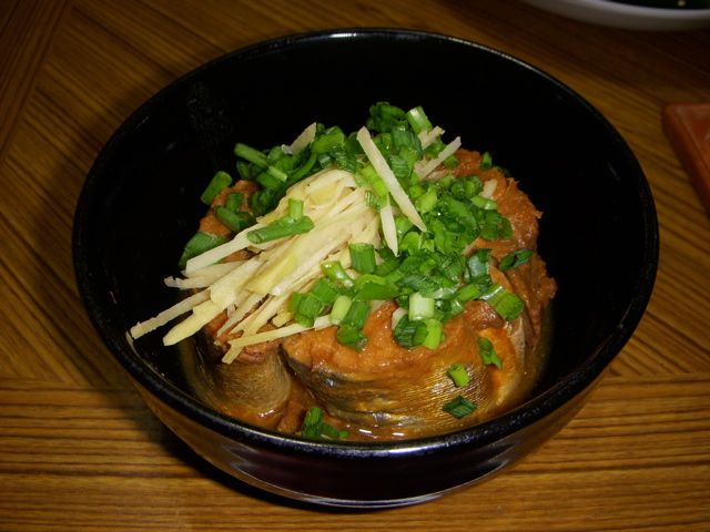 さばの味噌に缶を器にあけて、レンジで温めたあと、刻み生姜とネギをかけて出来上がり。