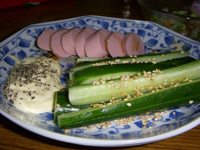 魚肉ソーセージにはラー油を、キュウリには白胡麻をふるとおいしくなります。