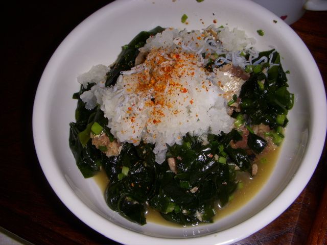 わかめを戻して、めんつゆ、酢、醤油で味付け、刻み(焼き油揚げを刻んだもの)とネギをかけ、最後にみぞれをかけ七味唐辛子を振りました。