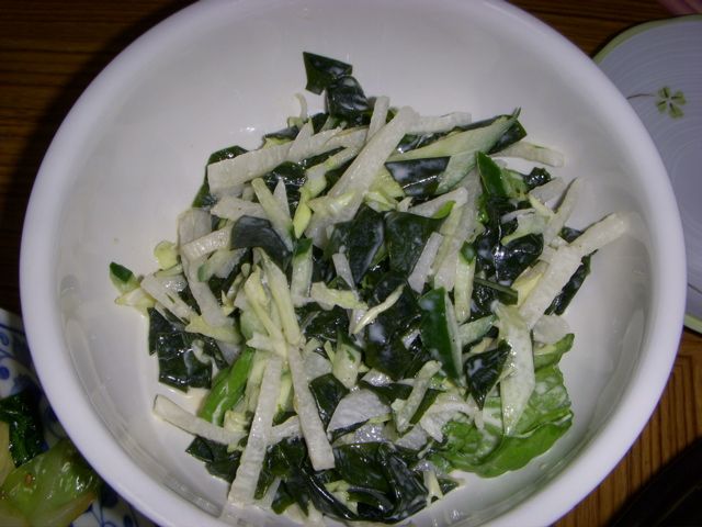 わかめを戻し、水分を切って余り野菜といっしょに、マヨネーズ、めんつゆ、わさびで和える。