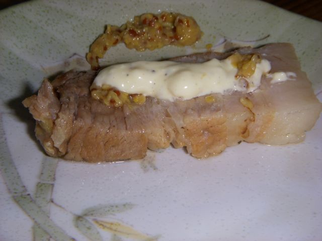 食べるときに、マスタードと、なんちゃってアリオリソース(おろしニンニクとマヨネーズを和えたもの)をつけて食べるから、あまりしょっぱくする必要はない。