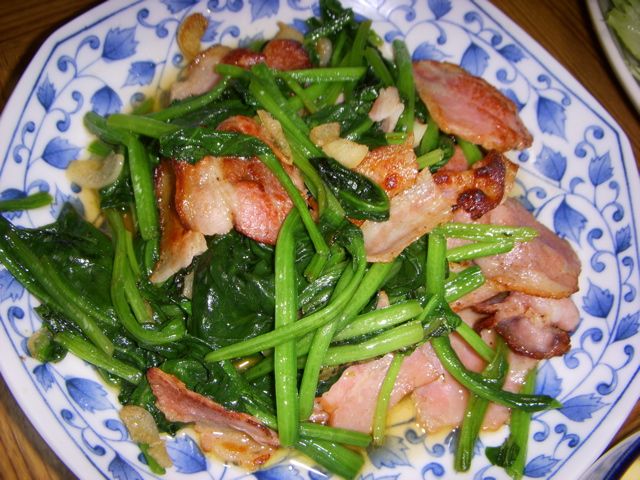 ほうれん草とベーコンのガーリック炒め。ニンニクは多めに。