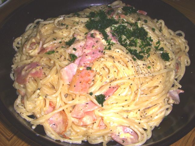 炒めたベーコンに茹でたスパゲティー(パスタ=日本語の「麺」にほぼ相似のイタリア語で、スパゲッティ、ペンネ、ラザニアなどを含む)、生クリームを入れ 味塩で味を調え、粉チーズを入れた溶き玉子を加えて出来上がり。