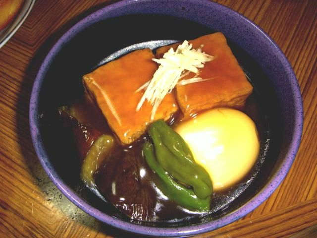 茄子と、ししとう、厚揚げ番長、半熟卵を出汁で煮て、鰹を強くした出汁のあんをかけてある。