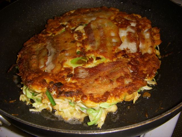 家では、関東なので大阪風の混ぜた具材を焼いて、お好み焼きとするが、バラ肉を敷いた上に具材をのせて、ゆっくり焼き上げると、カリカリになってとてもおいしい。