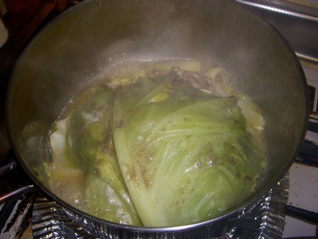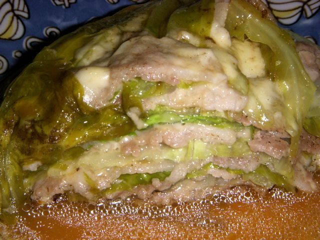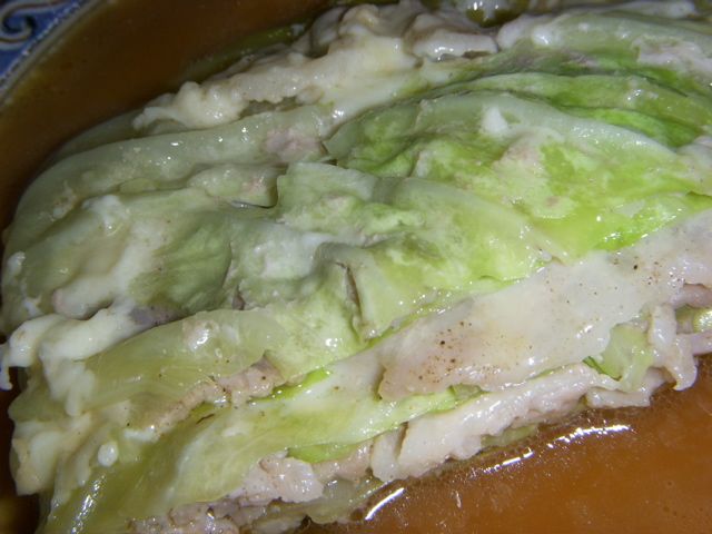 その上にキャベツの葉を敷き、スライスチーズ、豚肉の肩ロースのスライス(軽く塩コショウしておく)を順番にのせ、またキャベツ、チーズ、お肉の順で繰り返し何層か作る。