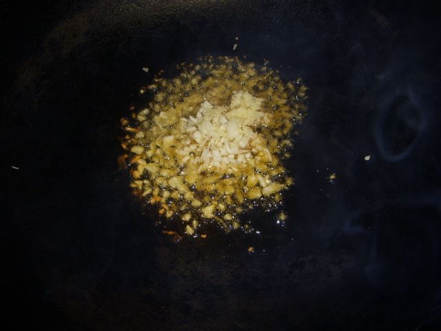 まずフライパンにごま油を注ぎ、刻んだショウガとニンニクを炒める。
