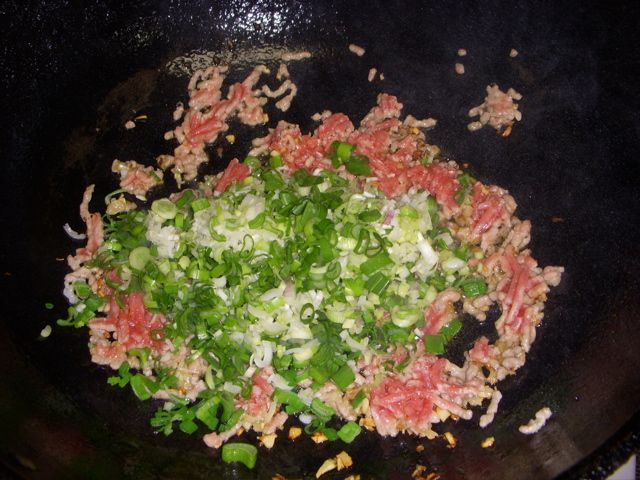 ひき肉を軽く炒めたら、俺は面倒くさいので、ネギもすぐ入れてしまう。