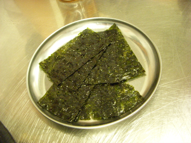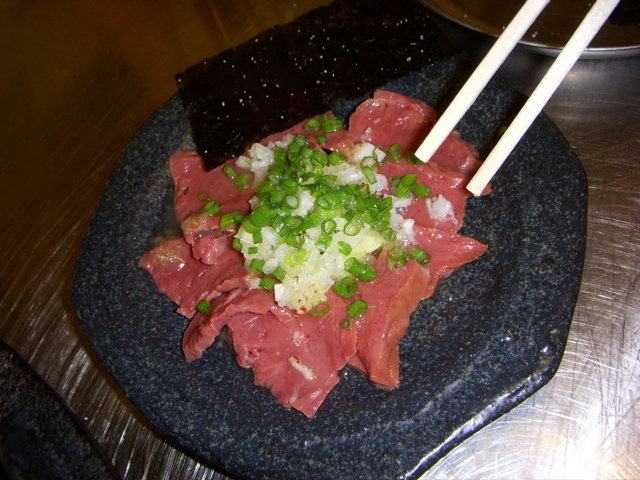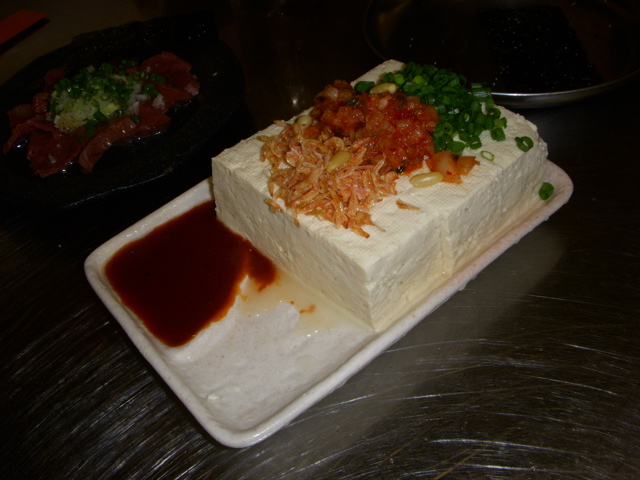俺達はいろいろ食べてきたので若干腹いっぱいだったから、とりあえずホルモン焼き2人前と、焼きを用意するのに時間がかかるので、先のつまみとして、韓国のり、韓国風冷奴とハツ刺を注文。