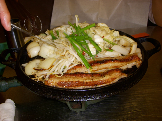 それからメインの、野菜とまる腸が乗ったプレートが運ばれてきて、コンロに火がともった。