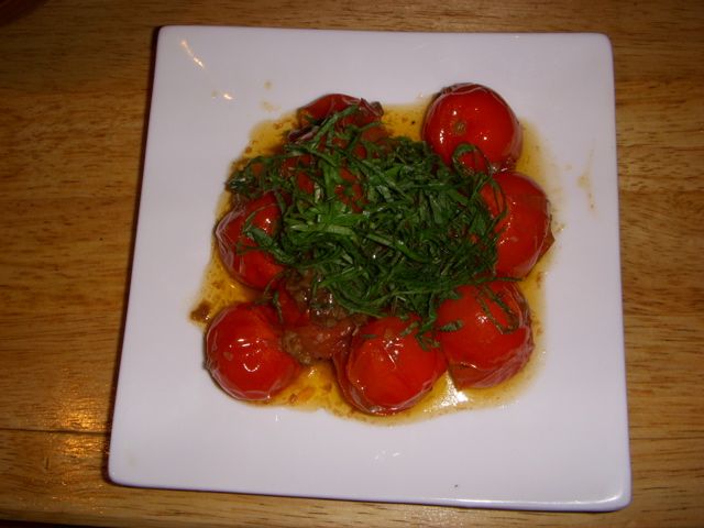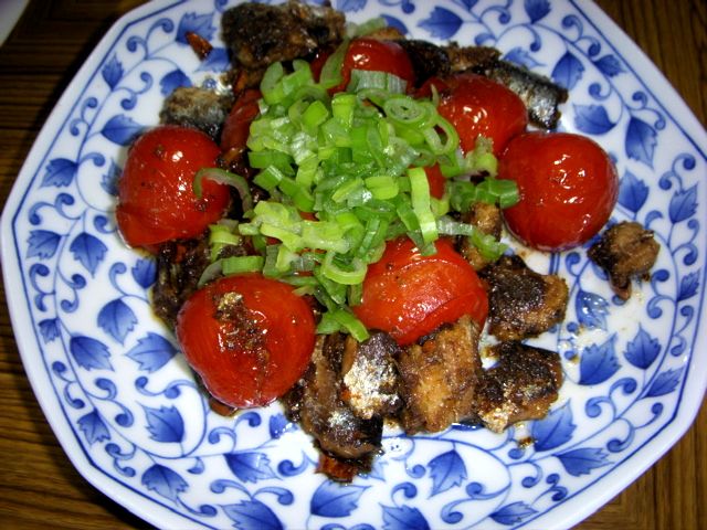 アンチョビとトマトをオリーブオイルで炒め、大場をのせたもの。