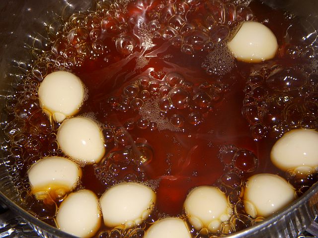 うずら玉子に色がついたら出来上がり。