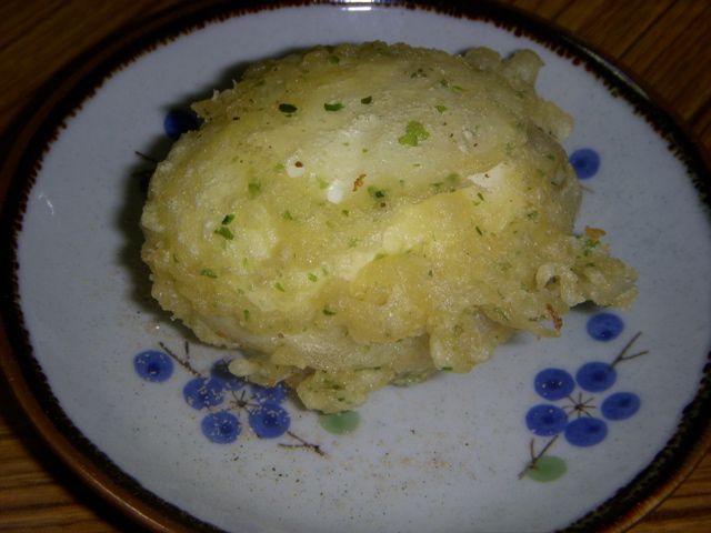 最後に揚げるから、青海苔を衣にまぜる。