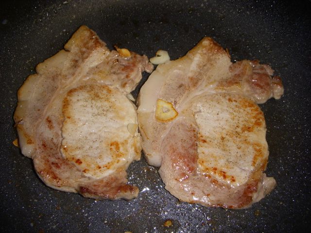 少なめの油でにんにくを軽く炒めその上に豚肉を置いて風味をつけなから焼く。