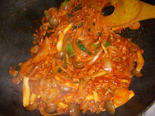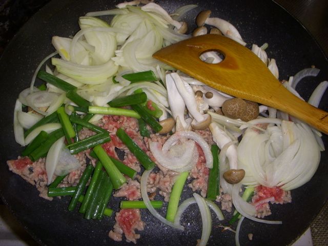 面倒なので、ひき肉を炒めすぎると固くなるから、軽く火が通ったら野菜をいれちゃう。