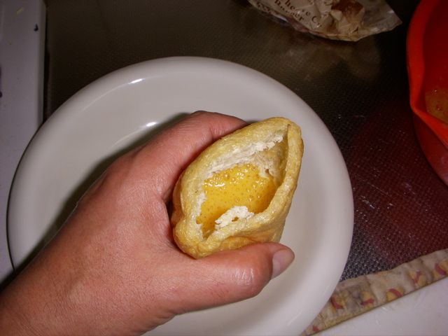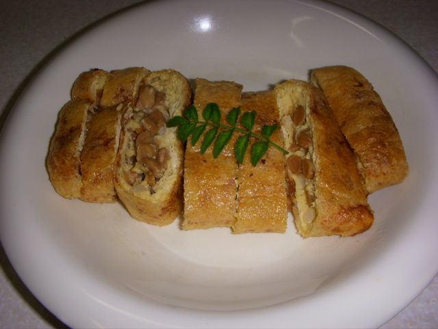 油揚げの中に、玉子と納豆、ネギなどを合わせたものを注ぎ込んで作ったもの。応用はたくさんあるが、今回はこれで。油で揚げてないからヘルシーで簡単に出来る。