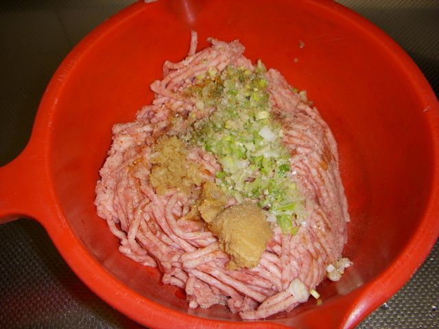 ネギと生姜のみじん切り(出来るだけ細かく)、味噌、片栗粉、ごま油、醤油、塩コショウを適量入れてよく合わせる。