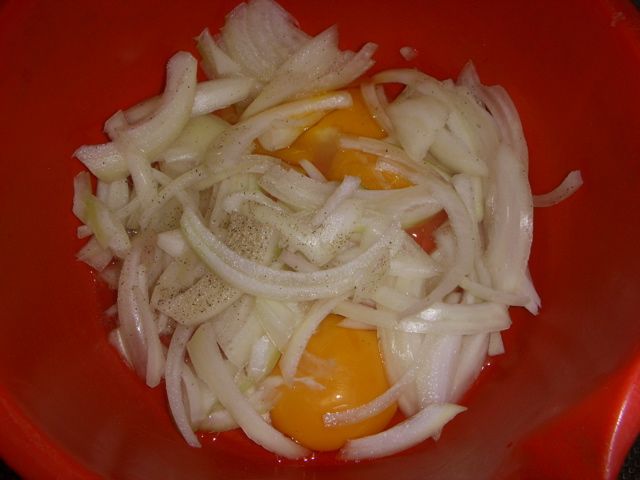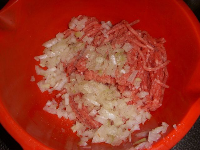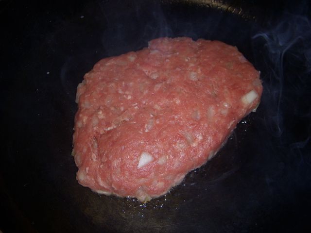 タマネギのみじん切りとひき肉、塩こしょう、パン粉と合わせて混ぜて焼くだけ。