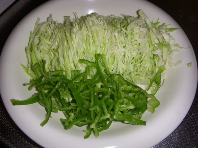 今日もきょうとで、うちにある材料。レタスなんて買ってなかったから、キャベツとかピーマン、水菜を使う。