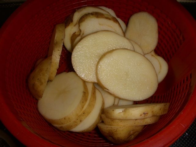 3、ジャガイモは串カツにはしないんだけど、家ではジャガイモフライが好きなので、いっしょに作りました。皮は面倒なのでよく洗って残し、あんまり厚くならない程度に切って水にさらしておきます。