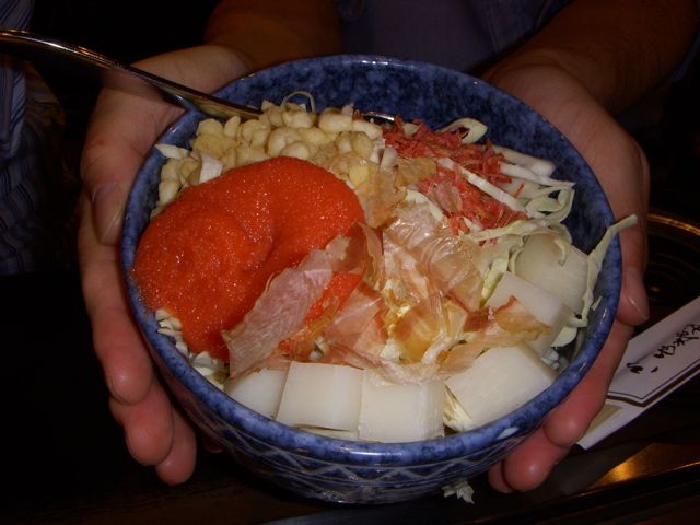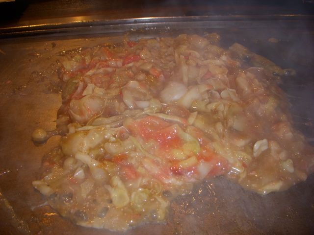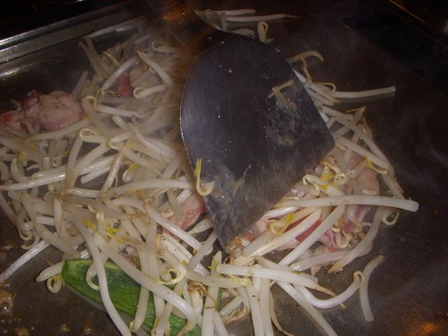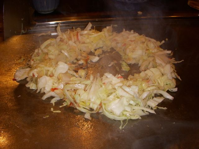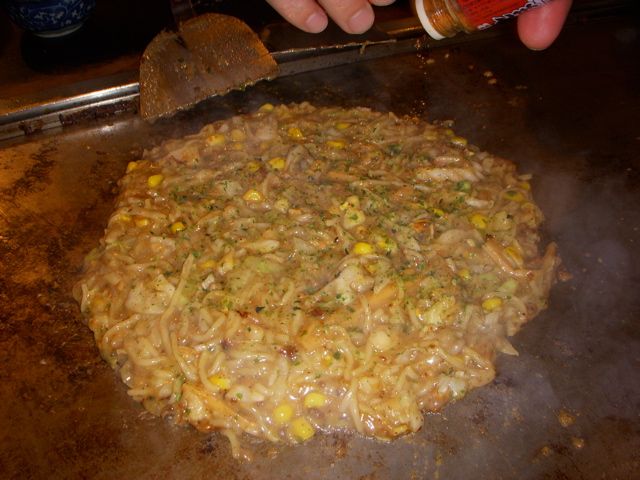 刻みが荒いときは、こてつきにくいから大きいこてで小さく砕くが、俺達は、砕いたらり、ちまちまやってるのは面倒なので、鉄板に延ばして焼いたら箸で取って食べたりもしてる。