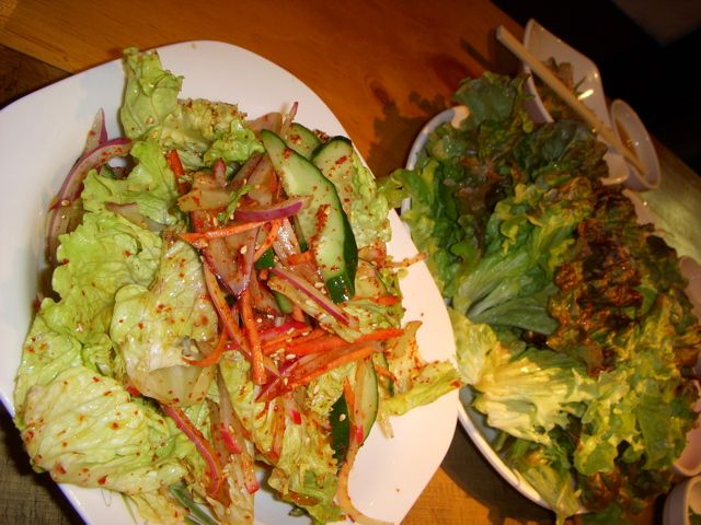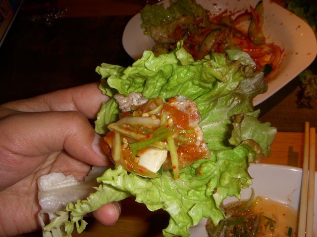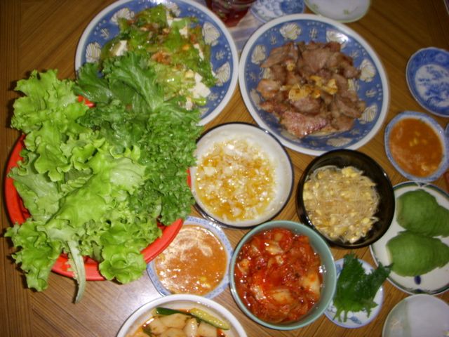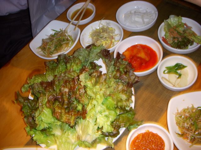 焼けた肉はレタスに、コチジャン(秘伝のタレ)、ネギタレをつけ、キムチなどをいっしょに包んで食べる。