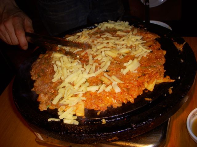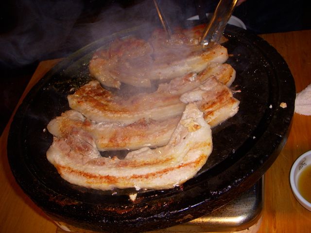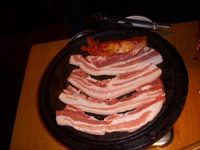 オンドル石が温まったら、バラ肉がのせられ、なぜかキムチまでのせられて…はて?