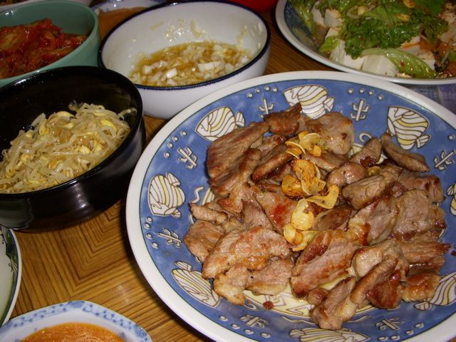 はじめてなんで、なんだかわからないから、定番のオンドル石生三段バラ(サムギョプサル)セットを注文。