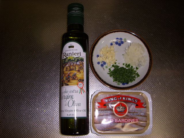 オイルサーディンに、みじん切りのにんにく、たまねぎ、パセリ、塩コショウ、オリーブオイル。