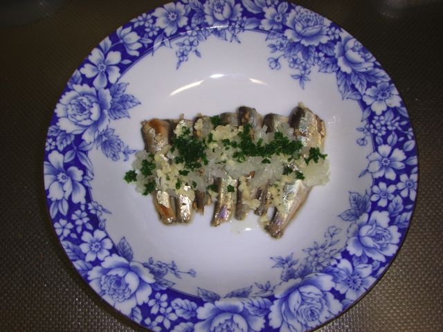 オイルサーディンをお皿にならべ、その上にみじん切りのにんにくとたまねぎ、パセリをのせる。