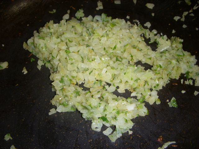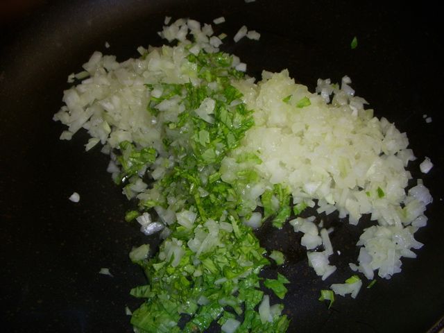 2、たまねぎとセロリの葉を炒める。